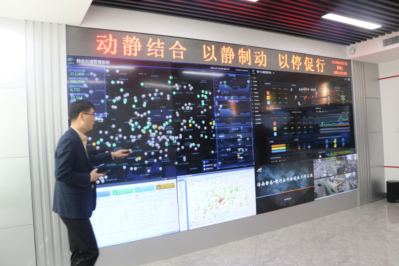 大家首先參觀了七樓數(shù)創(chuàng)中心?!俺鞘薪煌ù竽X”及智慧停車平臺(tái),“一云四中樞”智能交通總體架構(gòu),對(duì)接交通運(yùn)輸、氣象等部門管理數(shù)據(jù),匯入滴滴、高德等互聯(lián)網(wǎng)企業(yè)數(shù)據(jù),構(gòu)建動(dòng)態(tài)交通感知大數(shù)據(jù)資源池,為聚力打造的泉城智能交通管理新生態(tài)。