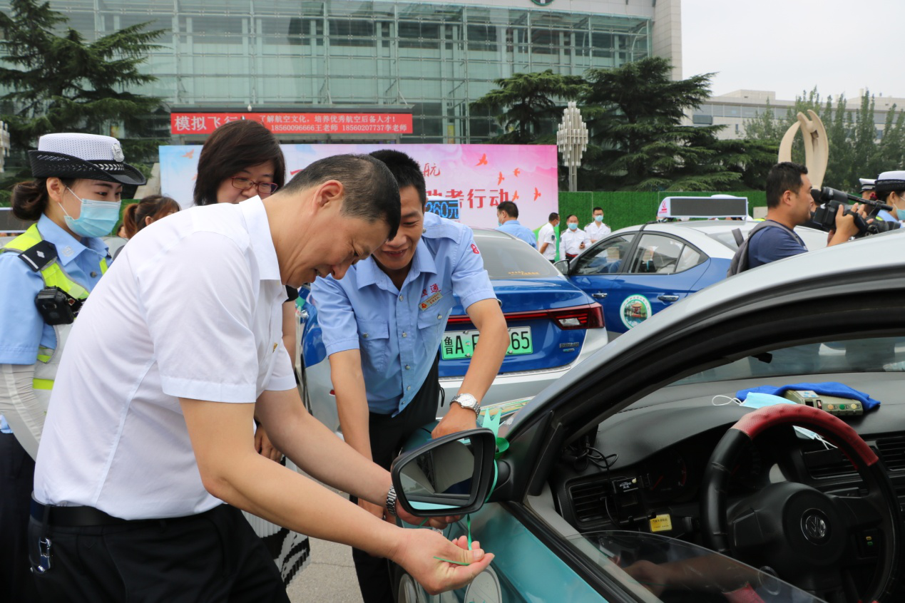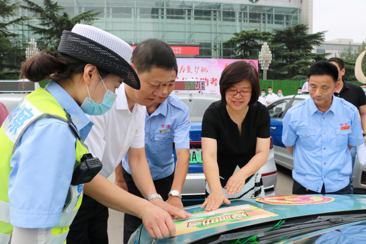 此次助考活動(dòng),舉辦方還為愛心助考車輛準(zhǔn)備了愛心助考貼和綠絲帶標(biāo)識(shí)。李培鋼董事長(zhǎng)與濟(jì)南廣播電視臺(tái)黨委委員、副臺(tái)長(zhǎng)許偉、濟(jì)南市公安局交警支隊(duì)副支隊(duì)長(zhǎng)趙洪銘等領(lǐng)導(dǎo)一同來(lái)到送考車輛前,為助考車輛貼上了愛心助考貼、綁上綠絲帶,標(biāo)志著愛心助考活動(dòng)正式啟動(dòng)。